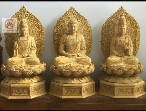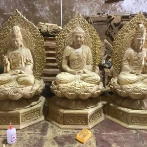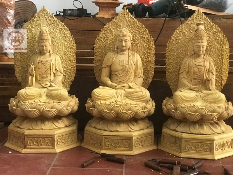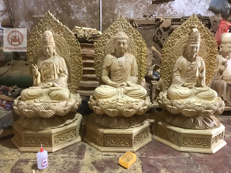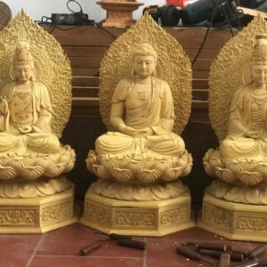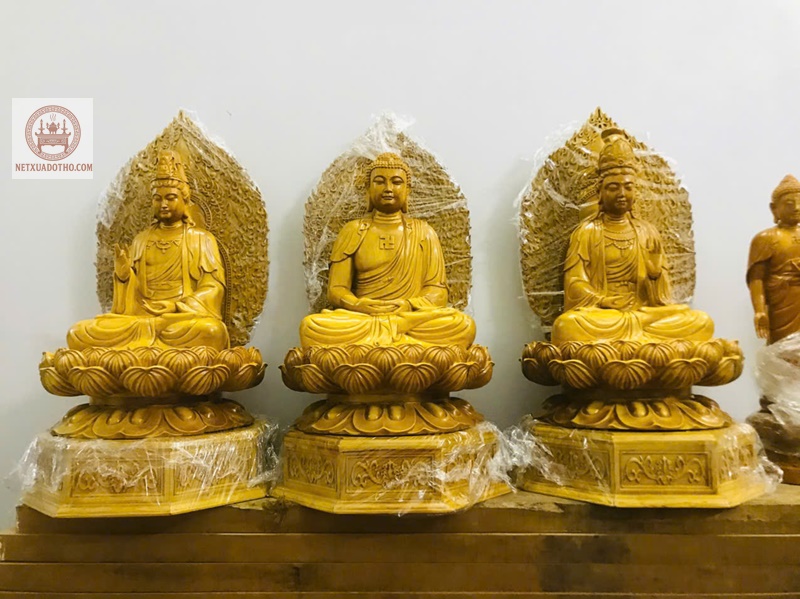 Tượng Tam Thánh Phật hay còn gọi là bộ Tây Phương Tam Thánh được cơ sở chỉnh chu hoàn thiện , được chế tác bằng gỗ mít rất cân đối và trang nghiêm.